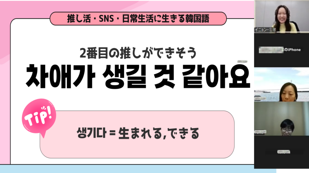 本イベントでは、「덕질(推し活)」「소속사(所属事務所)」「차애(2推し)」など、推し活をきっかけに自然と身につく韓国語表現を紹介。少し長いフレーズについては、「tip」として意味や使い方を解説し、背景まで理解できる構成でお届けしました。